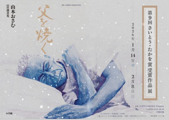 『父を焼く』複製原稿の展示、第9回さいとう・たかを賞選考委員の選評、受賞者のコメント、作品紹介など